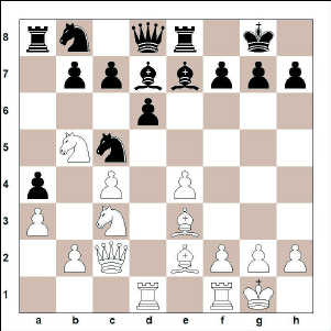 Óþægilegur leikur. Hvítur hótar 16. Bxc5. 15. … Rba6 16. Rxa4 Rxa4 17. Dxa4 Bg5 18. Bxg5 Dxg5 19. Dc2 Bxb5 20. cxb5 Rc5 21. f3 De3+ 22. Kh1 He5 23. Bc4 He7 24. Dd2 Það er eðlilegt að þvinga fram drottningaruppskipti peði yfir. 24. … Dxd2 25. Hxd2 b6 26. Hc1 Kf8 27. g3 Ha7 28. Bd5 Eftir þetta er hvíta staðan tæknilega unnin. Hróknum á a7 er haldið úti og hvítur á peði meira. 28. … g6 29. Kg2 f5 30. b4 Rd7 31. exf5 gxf5 32. Hc3 Rf6 33. Bc6 He1 34. Kh3 Ha1 35. Hdd3 Ha2 36. g4 fxg4 37. fxg4 d5 38. Hf3 Kg7 39. Hce3 Re4 40. Bxd5 Rg5 41. Kg3 Ha1 42. Hf5 h6 43. He7+ Kg6 44. Bf7+ Kg7 45. Bb3+ Kg6 46. Bc2 Með þeirri hugmynd að svara 46. … H1xc3+ eða 46. … H7xa3+ með 47. Hf3 fráskák og mátar.