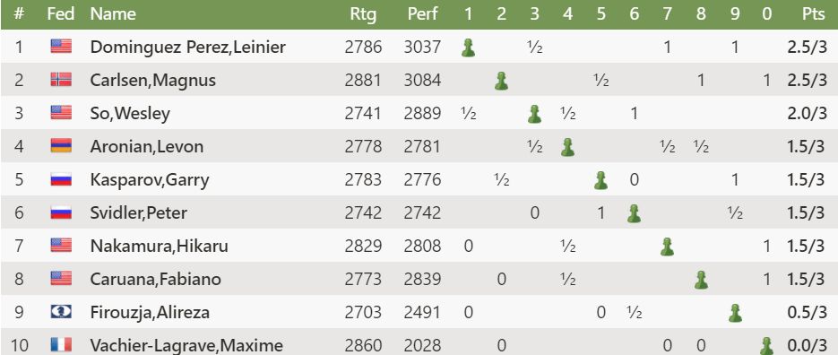Þátttaka Garry Kasparov (2783) vekur athygli. Hann hefur 1½ vinning og náði jafntefli gegn Magnúsi í 2. umferð. Sá eini sem náði punkti af heimsmeistaranum. Hann vann Alireza Firouzja (2703) í fyrstu umferð en tapaði fyrir Peter Svidler (2742) í þriðju umferð.