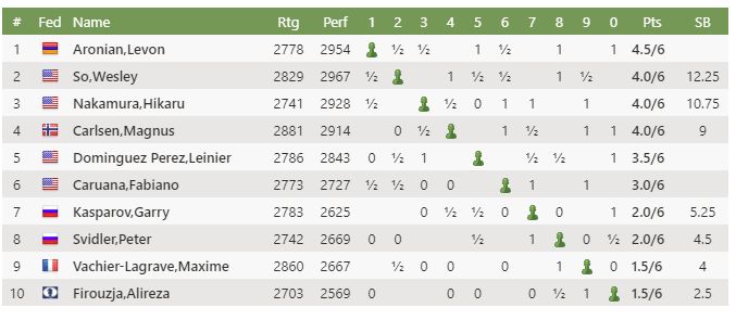 Garry Kasparov (2783) hefur 2 vinninga. Tapaði í gær fyrir Nakamura og Fabiano Caruana (2773).