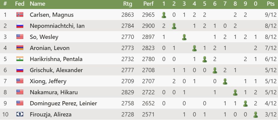 Heimsmeistarinn, Magnús Carlsen (2863), vann allar sínar skákir á öðrum degi Saint Louis-mótsins í gær og hefur náð forystu á mótinu. Hefur 9 stig af 12 mögulegum. Ian Nepomniachtchi (2784) og Wesley So (2770) eru í 2.-3. sæti með 8 vinninga.