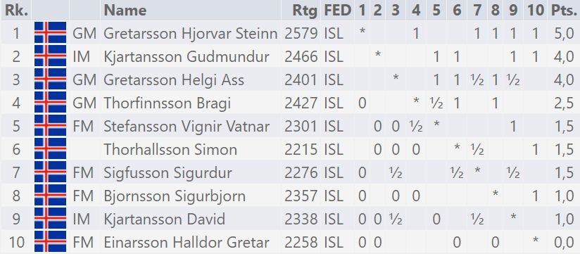 Guðmundur Kjartansson (2466) hefur líka fullt hús en hefur aðeins teflt 4 skákir. Hann vann Halldór Grétar Einarsson (2258) í gær. Helgi Áss Grétarsson (2401) sem hafði betur gegn Sigurbirni Björnssyni (2357) í gær hefur einning 4 vinninga en hefur teflt fimm skákir. Í kvöld verða tefldar þrjár frestaðar skákir úr 4. umferð og þá skýrast línur frekar.