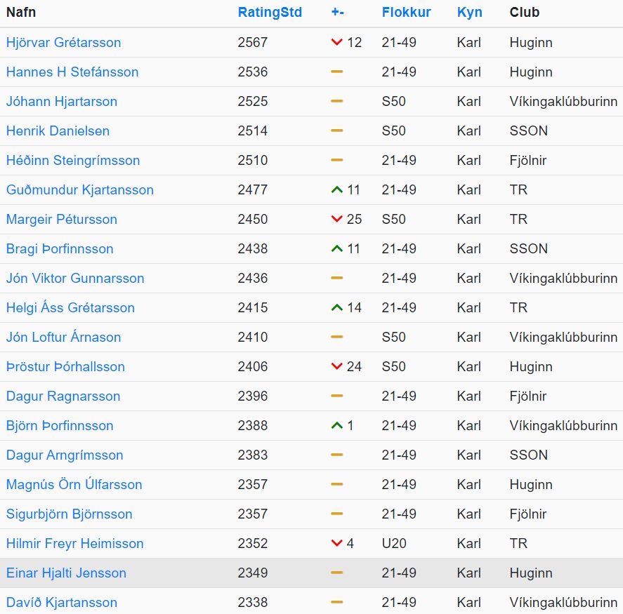 Hjörvar Steinn Grétarsson (2567) er stigahæsti skákmaður landsins. Í næstu sætum eru Hannes Hlífar Stefánsson (2536) og Jóhann Hjartarson (2525).