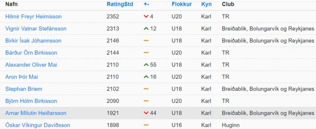 Hilmir Freyr Heimisson (2352) er stigahæsta ungmenni landsins. Í næstu sætum eru Vignir Vatnar Stefánsson (2313) og Birkir Ísak Jóhannsson (2146).
