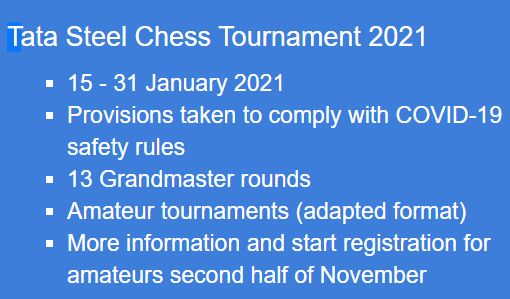 Enn er þó Tata Steel-mótið í Sjávarvík (Wijk aan Zee) á dagskrá 15.-31. janúar nk. og er vonandi að það má lifi þennan hvirfilbil aflýsinga/frestana af.