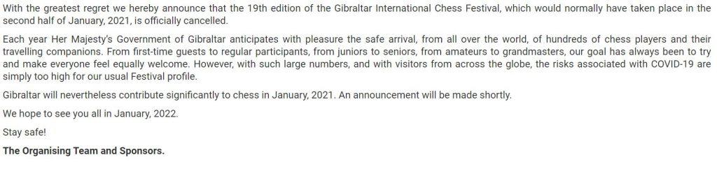 Gíbraltar-mótið sem átti að fara fram í janúar 2021 hefur einnig verið aflýst. Mótshaldar lofa samt einhverju framlagi til skákarinnar í janúar!