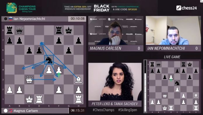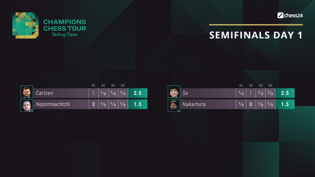Undanúrslit Skilling Open hófust í gær á Chess24. Magnús Carlsen vann fyrra einvígið gegn Ian Nepomniachtchi, þrátt fyrir ósannfærandi taflmennsku á köflum, og Wesley So á móti Hikaru Nakamura. Carlsen vann fyrstu skákina en hinum skákunum lauk með jafntefli. So vann einnig aðeins eina skák og þrjár fóru jafntefli.
