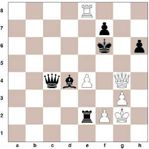 Staðan kom upp í úrslitakeppni á Skilling open, enn einu netmótinu sem stendur yfir þessa dagana, og er hluti mótaraðar sem Magnús Carlsen skipuleggur. Átta efstu í tólf manna keppni héldu áfram í útsláttarkeppni með fremur flóknu fyrirkomulagi þar sem tefld eru þrjú fjögurra skáka einvígi. Armeníumaðurinn virtist í erfiðleikum vegna hótunar á f2. En hann lagði ekki árar í bát og bjargaði sér á snilldarlegan hátt: