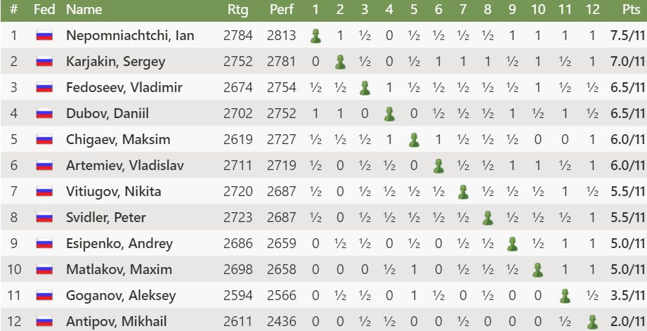 Svo fór að Ian Nepomniachtchi (2784) vann sigur í karlaflokki. Annar varð Sergey Karjakin (2752). Hann tapaði fyrir Daniil Dubov (2702) í lokaumferðinni í magnaðri skák að hálfu Dubovs.