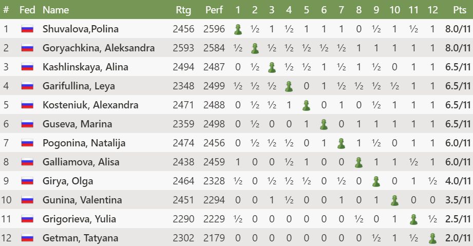 Í kvennaflokki urðu Polina Shuvalova (2456) og Aleksandra Goryachkina (2593) efstar og jafnar. Eftir jafntefli í tveim atskákum vann Goryachkina bráðabanaskák.