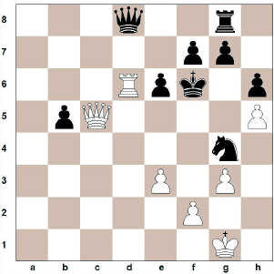 30. … g5 31. Rd4 Dc4 32. Rf5 Dxb4 33. Hc1! Kg6 34. Hxg7+ Kxf5 35. Hxg8 Bxc7 36. Bxc7 Db2 37. Hc5 Ke4 38. Hd8