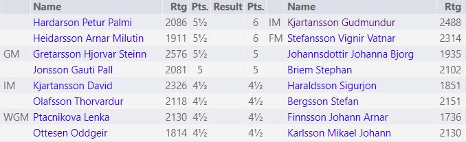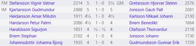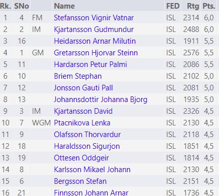 Vignir og Guðmundur eru efstir eins og áður hefur komið fram. Hjörvar er í 3.-5. sæti ásamt Arnari Milutin Heiðarssyni (1911) og Pétri Pálma Harðarsyni (2086). Arnar vann sóknarsigur á Mikael Jóhanni Karlssyni í aðeins 20 leikjum og Pétur lagði Lenku Ptácníková (2130) með afar smekklegri hróksfórn.