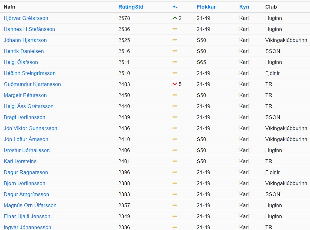 Hjörvar Steinn Grétarsson (2578) er stigalæsti skákmaður landsins. Hannes Hlífar Stefánsson (2536) er næststigahæstur og Jóhann Hjartarson (2525) er þriðji í stigaröð íslenskra skákmanna.