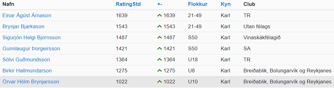 Sjö nýliðar eru á listanum. Stigahæstur þeirra er Einar Ágúst Árnason (1639) Næstur er Brynjar Bjarkason (1543) og þriðji er Sigurjón Helgi Björnsson (1487).