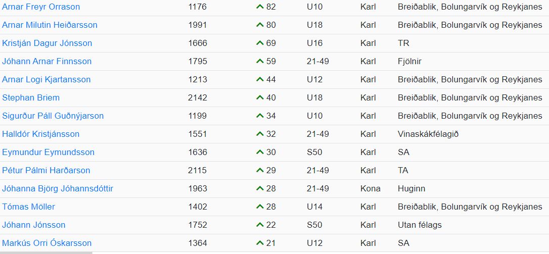 Arnar Freyr Orrason (+82) hækkaði mest á stigum frá síðasta lista. Næstir eru Arnar Milutin Heiðarsson (+80) og Kristján Dagur Jónsson (+69).