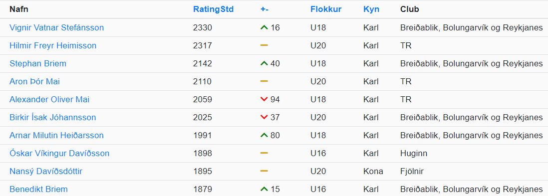 Vignir Vatnar Stefánsson (2330) er stigahæsta ungmenni (u20) landsins. Hilmir Freyr Heimisson (2317) og Stephan Briem (2142) eru næstir.