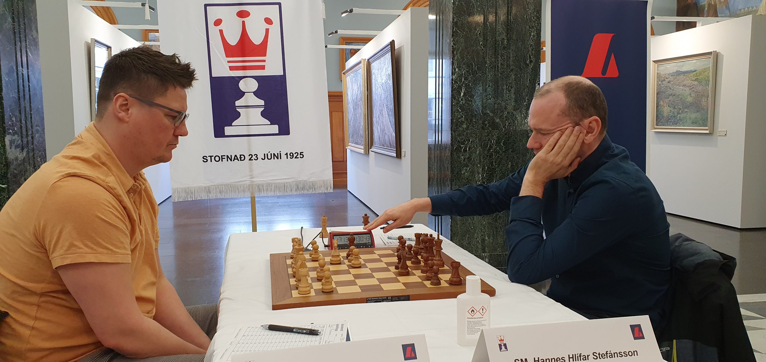 Helgi Áss Grétarsson jafnaði hins vegar metin á mótin á Jóhanni Hjartarsyni í afar fjörugri skák. Þeir þurfa því að tefla til þrautar með skemmri umhugsunartíma á morgun. Þeir byrja á tveimur atskákum (25+10) og hefur Helgi hvítt í fyrstu skák. Sigurvegarinn úr því einvígi mætir Hannesi í undanúrslitum. Í hinni viðureign undanúrslita mætast Hjörvar Steinn og Guðmundur.