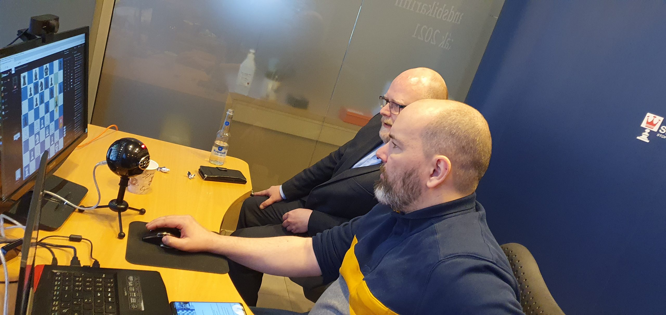 Helgi og Hannes heilsast að Covid-sið í upphafi skákar.