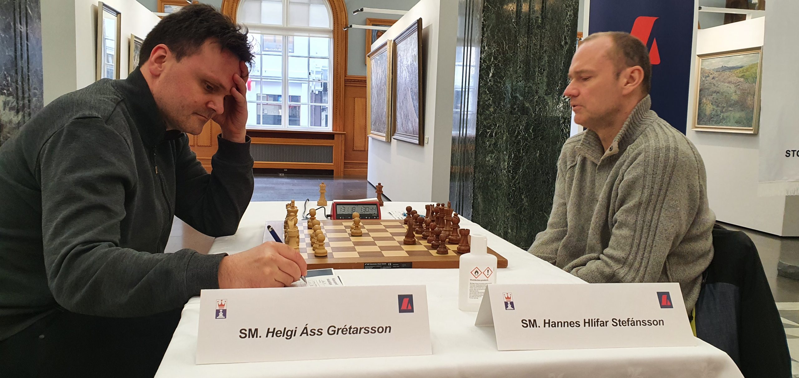 Skák heimsmeistaranna fyrrverandi Helga Áss Grétarssonar og Hannesar Hlífar Stefánssonar vakti óneitanlega meiri athygli. Eftir 16 leiki kom þessi staða upp. Hannes lék síðast 16…g4??