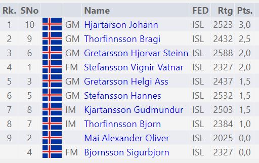 Andstæðingur Björns, Hjálmar Theodorsson gafst upp eftir 11…De8 með tvöfaldri hótun! Hægt er að sjá skákina í viðauka við skák Hjörvars og Björns með því að smella á punktana.