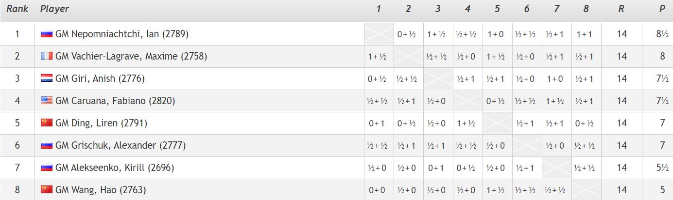 Áskorendamótinu lauk í gær í Katrínarborg. Mikið gekk á í lokaumferðinni og meðal annars töpuðu tveir efstu menn sínum skákum. Nepo (2789) tapaði fyrir Ding Liren (2791) sem „vann“ seinni hluta mótsins og Giri gegn Alekseenko. MVL (2758) vann Wang Hao (2763) og náði um leið öðru sætinu á mótinu. Giri og Ding Liren enduðu í 3.-4. sæti. Að móti loknu tilkynnti Wang Hao að hann væri hættur atvinnumennsku í skák.