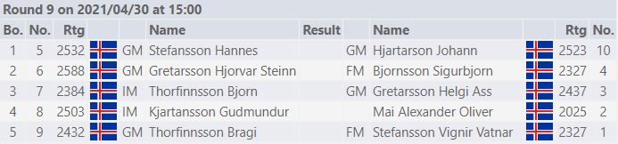 Hjörvar eins og áður sagði er með pálmann allt að því í höndunum. Hann hefur hálfs vinnings forskot og versta mögulega sviðsmynd virðist vera einvígi um titilinn. Ef allt er eðlilegt er Hjörvar illviðráðanlegur með hvítu mönnunum en sjáum hvað setur á morgun!