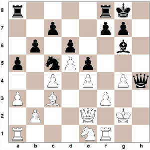 1. d4 Rf6 2. c4 e6 3. Rc3 Bb4 4. e3 O-O 5. Bd2 b6 6. Rf3 Bb7 7. Bd3 d6 8. a3 Bxc3 9. Bxc3 Re4 10. Bxe4 Bxe4 11. d5 Rd7 12. O-O e5 13. He1 a5 14. f3 Bf5 15. e4 Bg6 16. g4?
