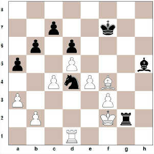 35. … Bxf3+ 36. Kd1 Bxd1 37. e5 Rf5 38. b4 a4 39. exd6 cxd6 40. Bg5 Bb3