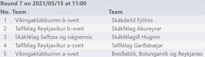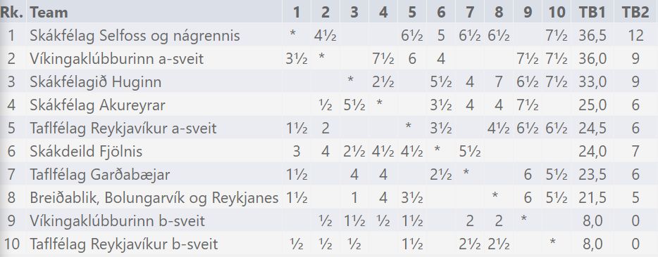 Huginn, sem vann 7½-½ sigur á b-sveit Taflfélags Reykjavíkur virðist hafa möguleika á að blanda sér í toppbaráttuna. Sveitin er nú 3½ vinning á eftir SSON en er eingöngu skipuð Íslendingum og hefur sennilega sterkustu sveitina í síðari hlutanum. Huginn á eftir mæta bæði SSON og Víkingum.