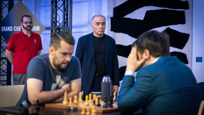 Nepo er í öðru sæti. Garry Kasparpov mætti á svæðið og fylgdist með fyrrum samlanda sínum. Mynd: Lennart Ootes.