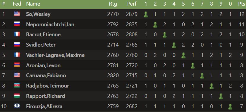 Atskákhluta Parísar-mótsins í at- og hraðskák lauk í dag. Mótið er hluti af Grand Chess Tour. Wesley So (2770) er efstur eftir atskákina. Hann hlaut 6 vinninga í 9 skákum og fær fyrir það 12 stig. Ian Nepomniachtchi (2792) er annar með 11 stig. Sá sem kom langmest á óvart í atskákinni er heimamaðurinn Etianne Bacrot (2678) sem varð þriðji með 10 stig. Vladimir Kramnik tekur sæti hans í hraðskákhlutanum sem hefst í dag.