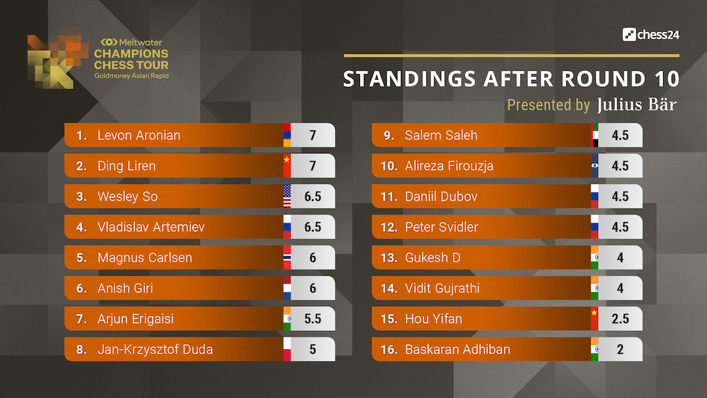 Levon Aronian og Ding Liren er efstir með 7 vinninga þegar 10 umferðum af 15 er lokið. Magnús Carlsen og Anish Giri eru í 5.-6. sæti með 6 vinninga.