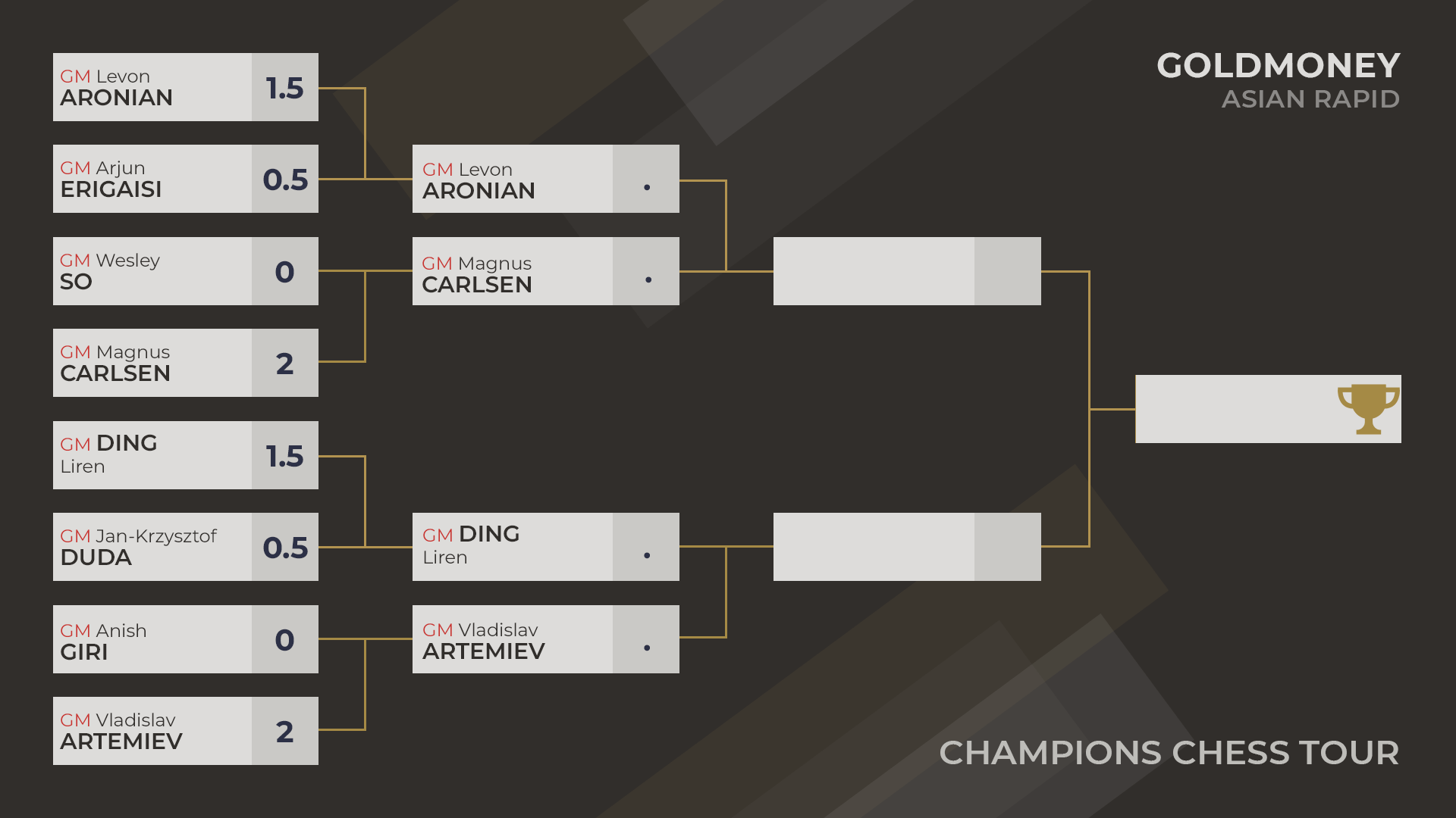 Átta manna úrslitum asíska gullpeningamótsins lauk í gær á Chess24. Magnús Carlsen vann sigur á Wesley So í átta manna úrslitum. Mesta athygli vakti öruggur sigur á Vladislav Artimiev á Anish Giri. Auk þeirra eru Levon Aronian og Ding Liren í undanúrslitum.