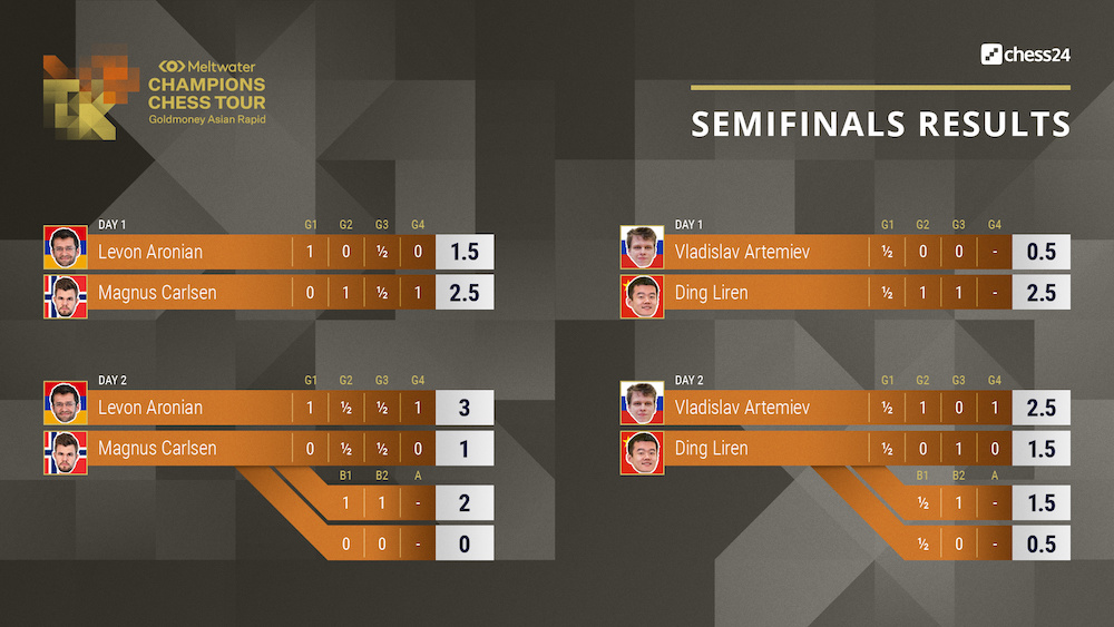 Það verða Levon Aronian og Vladislav Artemiev sem mætast í úrslitum asíaska gullmótsins á Chess24. Báðir komu þeir til baka eftir að hafa tapað fyrsta einvíginu og unnu það síðara. Þá var teflt til þrautar í hraðskák þar sem þeir unnu báðir. Aronian vann Carlsen 2-0 í hraðskákinni.