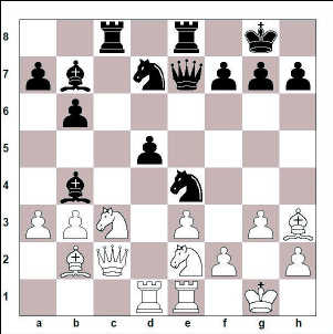 1. Rf3 d5 2. e3 Rf6 3. c4 c6 4. Rc3 e6 5. b3 Bd6 6. d4 0-0 7. Dc2 Rbd7 8. Be2 b6 9. 0-0 Bb7 10. Bb2 De7 11. Had1 Had8 12. Hfe1 Hfe8