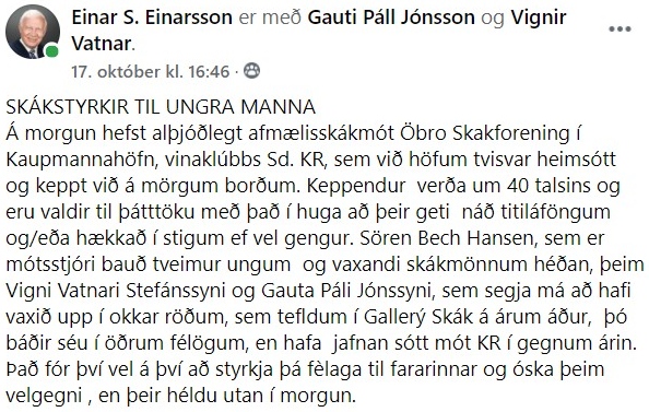 Í gær og í dag eru tefldar tvær umferðir. Þeir félagarnir töpuðu báðir í fyrstu umferð en komu sterkir inn í 2. umferð. Þá vann Vignir Vatnar danska FIDE-meistarann Jens Albert Ramsdal (2259) og Gauti gerði jafntefli við danska FIDE-meistarann John Filip Rendboe (2180).