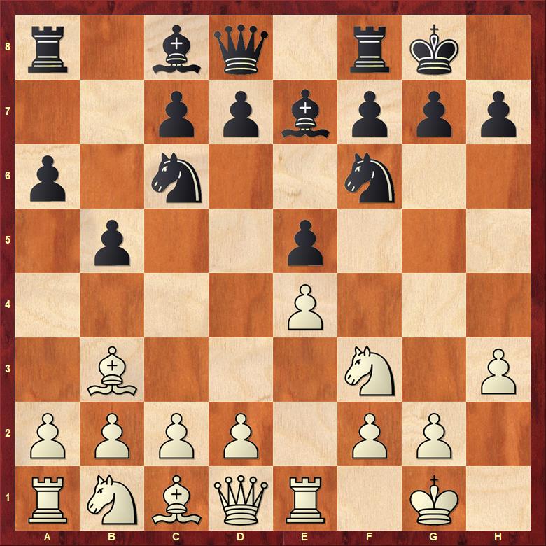 8…Ra5!? Óvæntur leikur sem hefur þó verið leikið áður í bréfskák. Rússinn tók peðið og skákin tefldist 9. Rxe5 Rxb3 10.axb3 Bb7 11. d3 d5 12. exd5 Dxd5 13. Df3 Bd6.