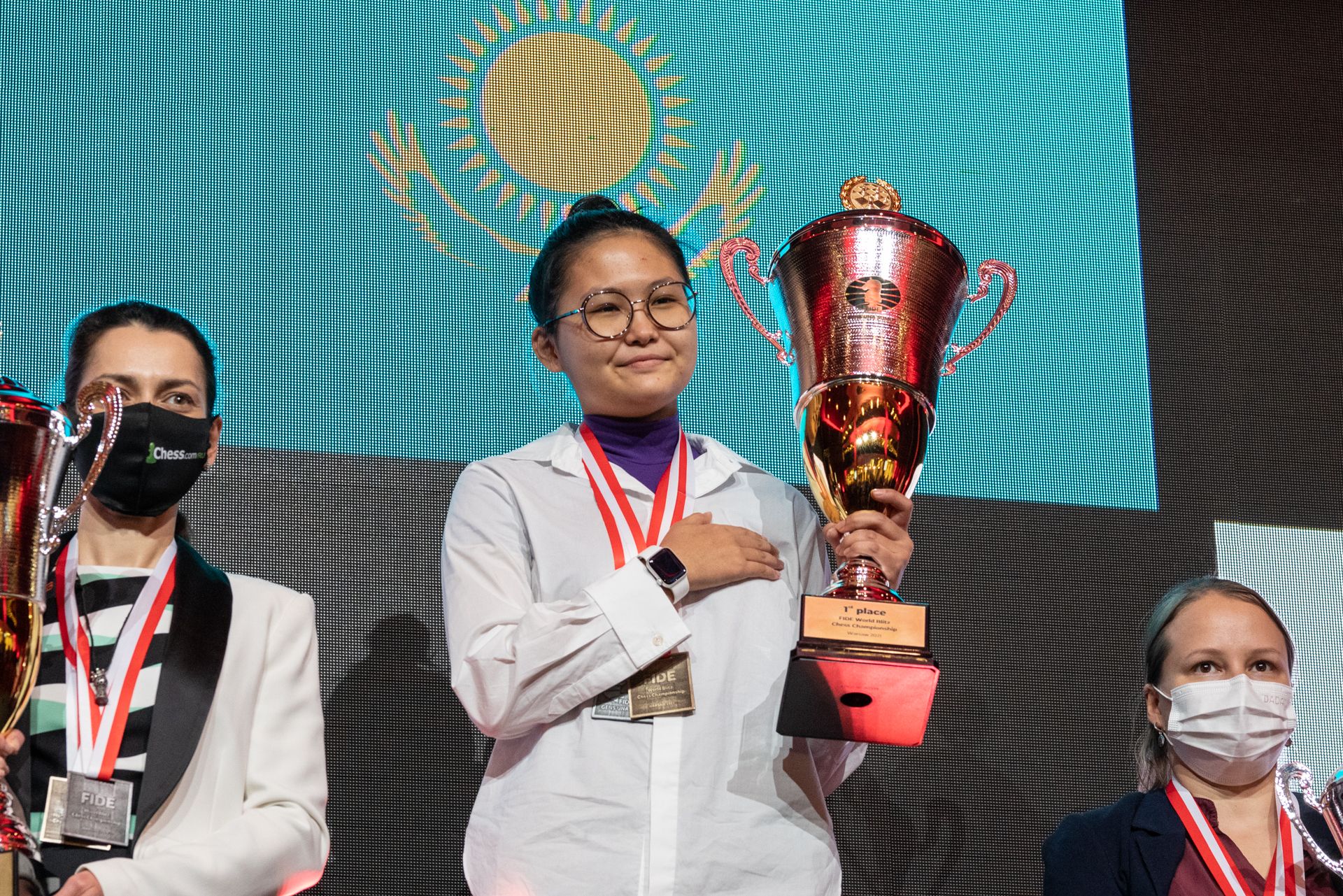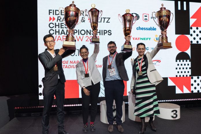 Alexandra Kosteniuk, Bibisara Assaubayeva and Valentina Gunina were the medallists in both women’s events; Gunina won the bronzes, Kosteniuk won gold in the rapid and Assaubayeva in the blitz. Congratulations! #RapidBlitz pic.twitter.com/dwKowdO0rO