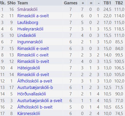 Rimaskóli varð í öðru sæti með 22 vinninga. Eina sveitin sem náði að veita Smáraskóla einhverja keppni.