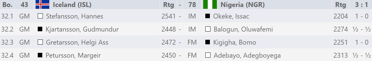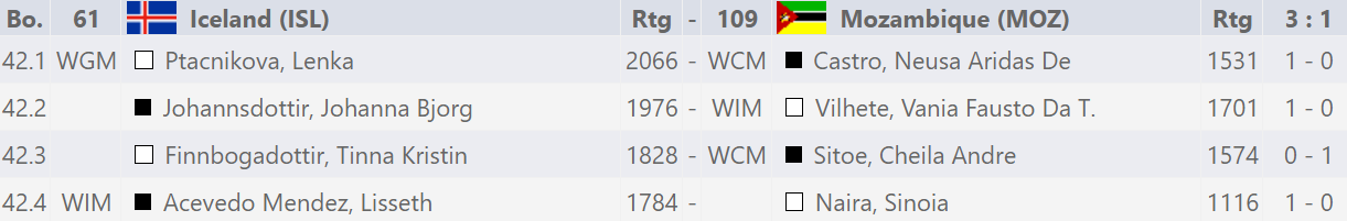 Kvennaliðið lagi sveit Mósambík í æsispennandi viðureign. Tinna tapaði en Lenka vann nokkuð örugglega. Liss sneri svo erfiðri stöðu sér í vil og viðureignin réðist í æsispennandi skák Jóhönnu á 2. borði þegar andstæiðngur hennar lék sig í mát í langri skák.