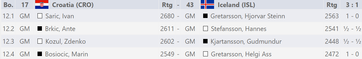 Erfitt verkefni þar sem lið Króata er nr. 17 í stigaröðinni. Á fyrsta borði er hinn grjótharði Ivan Saric sem nálgast 2700 stiga múrinn óðflug. Á góðum degi er þetta hinsvegar sveit sem við eigum að geta staðið í og náð úrslitum gegn ef allir eru að tefla vel.