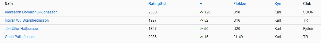 Aleksandr Domalchuk-Jonasson (+126) hækkaði langmest frá ágúst-listanum. Hann náði 2300 skákstigum og var vegna þess utnefndur FIDE-meistar í gær. Næstir eru Ingvar Wu Skarphéðinsson (+52) og Jón Úlfur Hafþórsson (+50)