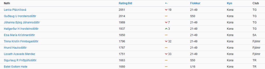 Lenka Ptácníková (2051) er stigahæsta skákkona landsins. Í næstu sætum eru Guðlaug Þorsteinsdóttir (2014) og Jóhanna Björg Jóhannsdóttir (1969).