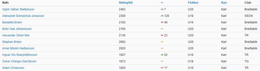 Vignir Vatnar Stefánsson (2452) er sem fyrr langstigahæsta ungmenni landsins. Í næstu sætumm eru Aleksandr Domalchuk-Jonasson (2300) og Benedikt Briem (2183).