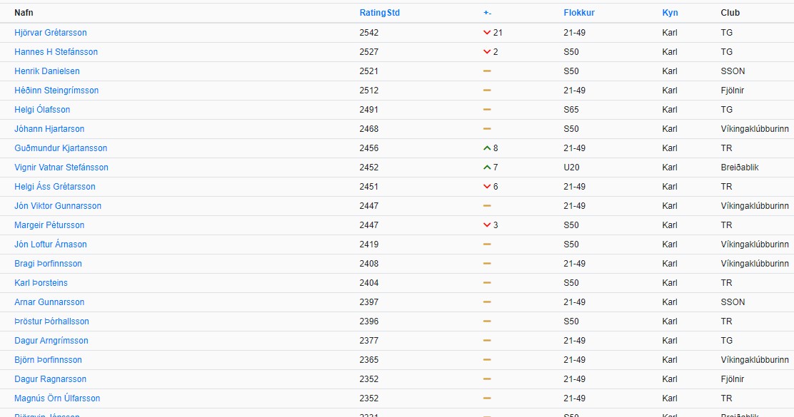 Hjörvar Steinn Grétarsson (2542) er stigahæsti skákmaður landsins. Í næstu sætum eru Hannes Hlífar Stefánsson (2527) og Henrik Danielsen (2521).