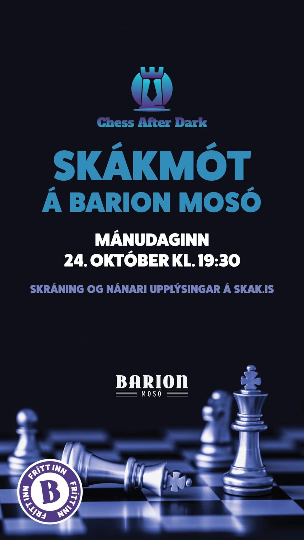 Chess After Dark, í góðu samstarfi með Barion, heldur skákmót mánudagskvöldið 24. október klukkan 19:30.