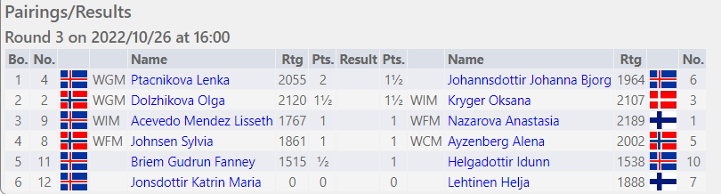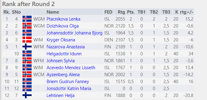 Í þriðju umferðinni mætast Lenka og Jóhanna. Guðrún Fanney og Iðunn sem hafa byrjað vel mætast svo í öðrum íslendingaslag. Þriðja umferðin hefst klukkan 16:00 á morgun á Hotel Natura.