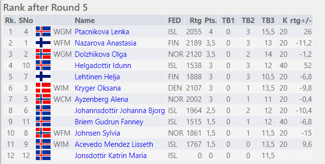 Lenka heldur hálfum vinningi í forskot en Nazarova og Dozhikova narta í hælana. Lenka hefur hinsvegar teflt við þær báðar og fær ágætis pörun í 6. umferðinni. Iðunn er næst íslensku stelpanna með 3 vinninga. Hún fær svart á Oksönu Kryger.