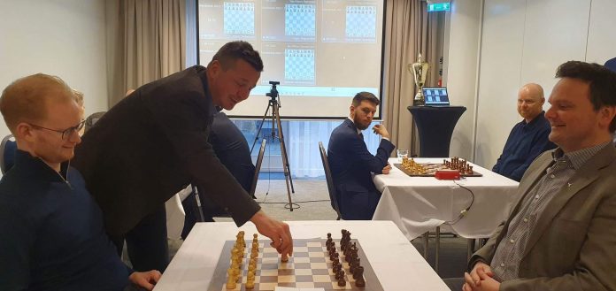 Íslandsmótið í Fischer-slembiskák hófst í gær á Center Hotels Plaza við Ingólfstorg. Byrjaði mótið á því að Guðlaugur Þór Þórðarson umhverfis- og loftslagsmálaráðherra opnaði mótið og lék fyrsta leikinn í skák Hjörvar Steins og flokkbróður síns Helga Áss.