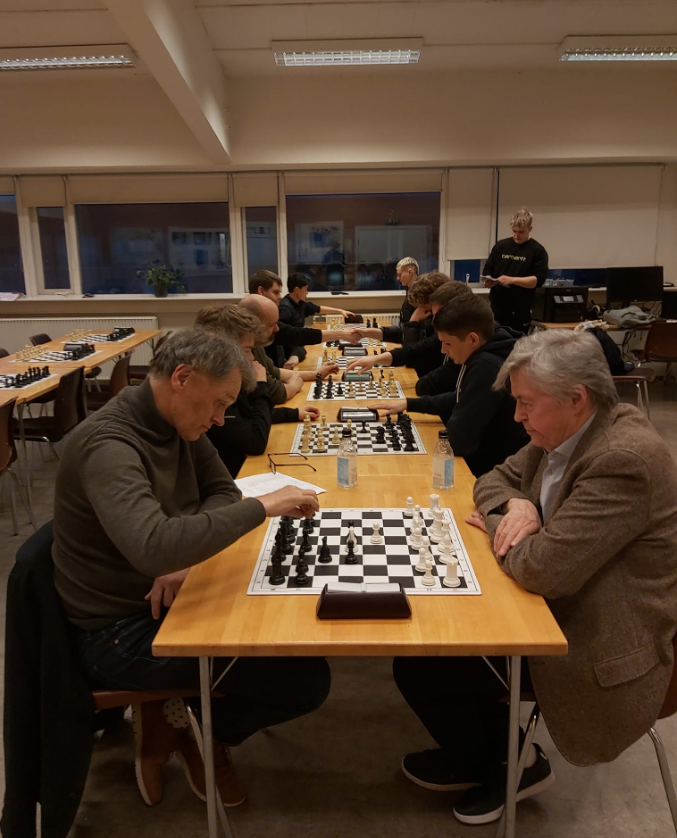 Að fyrirlestri loknum var svo taflmennska og slóst Guðmundur óvænt í hópinn og sýndi að hann hefur litlu gleymt. Helgi Ólafsson varð hlutskarpastur í 11. umferða móti en Guðmundur hlaut 7,5 vinning og lagði flesta af stigahæstu mönnum þessa æfingamóts að velli.
