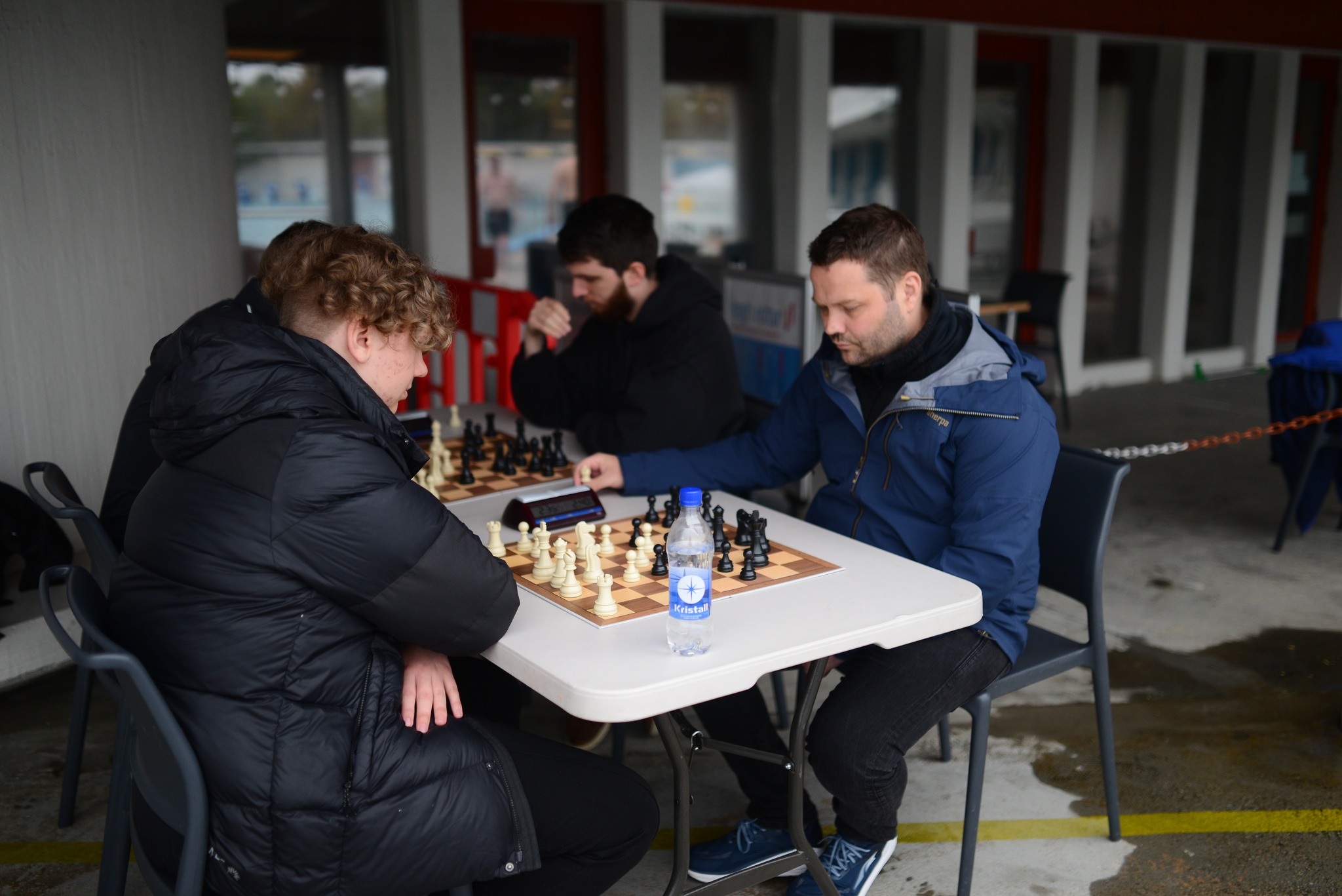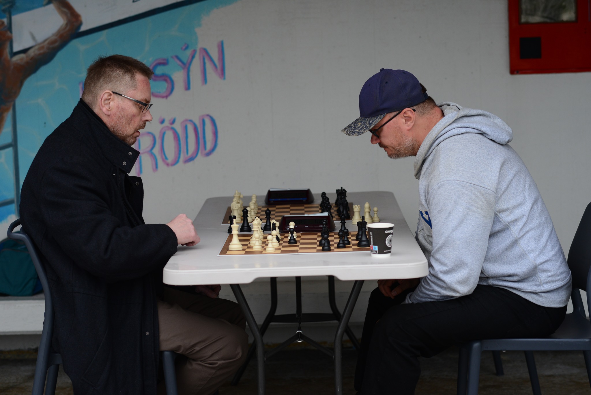 Undanfarið hefur einungis verið teflt utandyra, bæði undir súð og undir beru lofti. Að þessu sinni rigndi þannig hluti mótsins fór fram við ágætis aðstæður í gömlu afgreiðslunni, þar sem er ágætis pláss til taflmennsku. Skákmót Laugardalslaugar var því að þessu sinni inni- og útiskákmót!